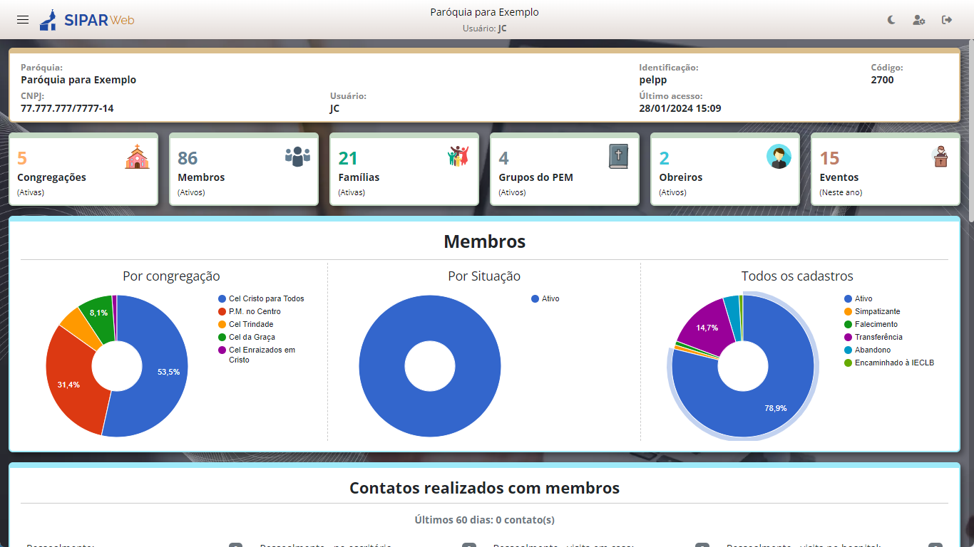 No Dashboard (tela inicial), apresentamos um resumo abrangente da paróquia, permitindo a análise rápida de informações cruciais, como a composição da paróquia, quantidade de membros, famílias, grupos de estudo, eventos, lista dos aniversariantes e muito mais.