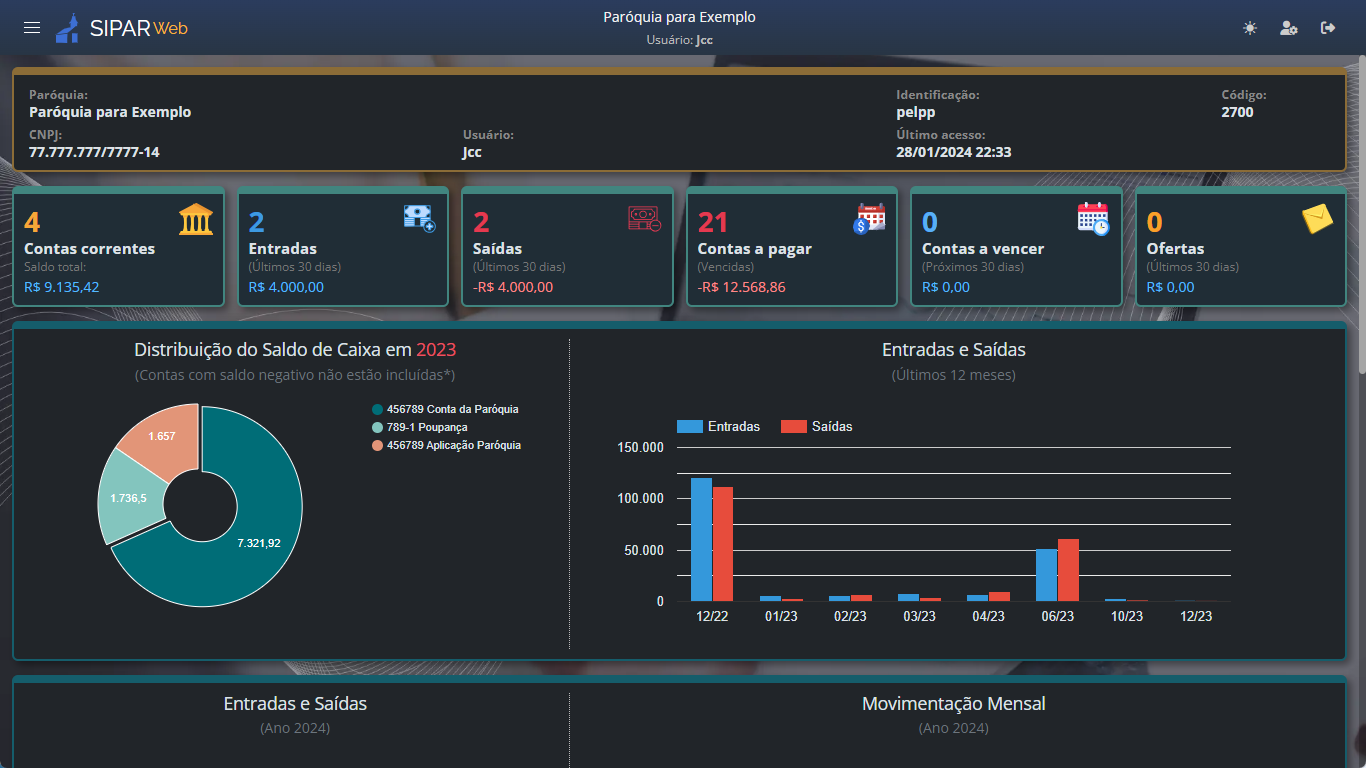 No painel inicial dedicado aos usuários com perfil Tesouraria, apresentamos um resumo claro e conciso da situação financeira da paróquia. Além disso, fornecemos gráficos intuitivos que mostram as entradas e saídas, bem como as ofertas e coletas dos últimos 12 meses.